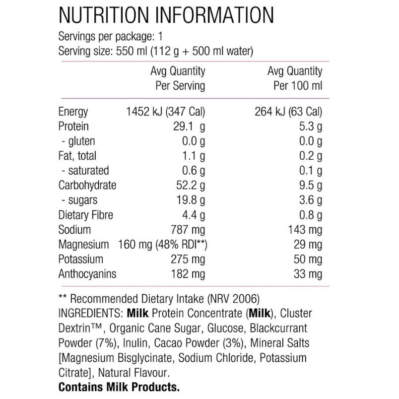 Milk Protein Concentrate (Milk), Cluster Dextrin™, Organic Cane Sugar, Glucose, Blackcurrant Powder (7%), Inulin, Cacao Powder (3%), Mineral Salts [Magnesium Bisglycinate, Sodium Chloride, Potassium Citrate], Natural Flavour. Contains Milk Products.